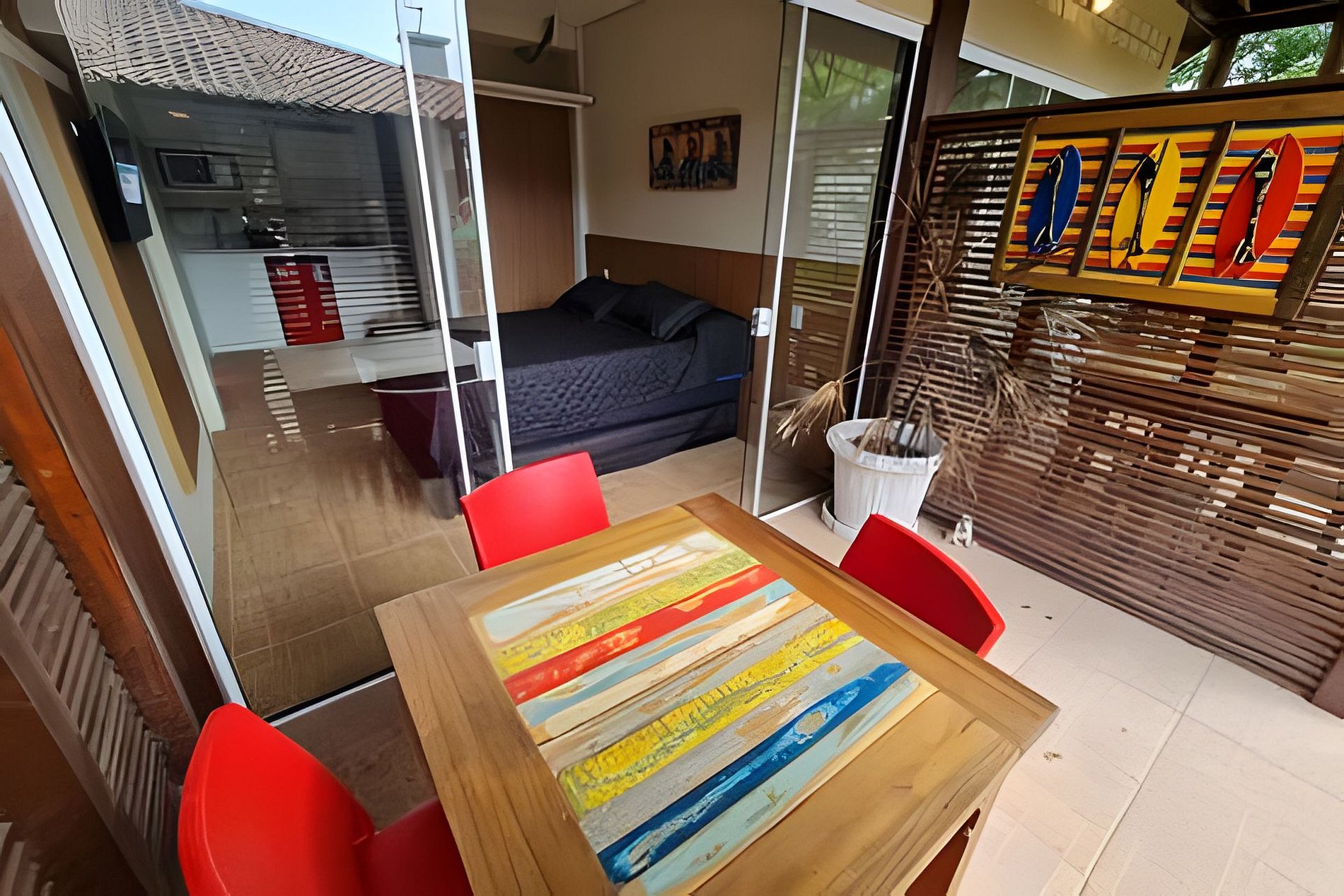 Apto. top, tipo FLAT ou STUDIO, com varanda, smart TV, wifi, ar condicionado, cozinha, churrasqueira, sala de jogos, no meio da natureza em um lugar tranquilo, próximo ao centro da Praia do Rosa. Acomoda até 4 (quatro) pessoas, possui uma cama de casal e mais duas camas auxiliares. O Espaço é incrível com árvores frutíferas, fogo de chão, bilhar, ping pong etc. Local para eventos e esportes. Relaxe em lugar tranquilo mas próximo ao Centro da Praia do Rosa.